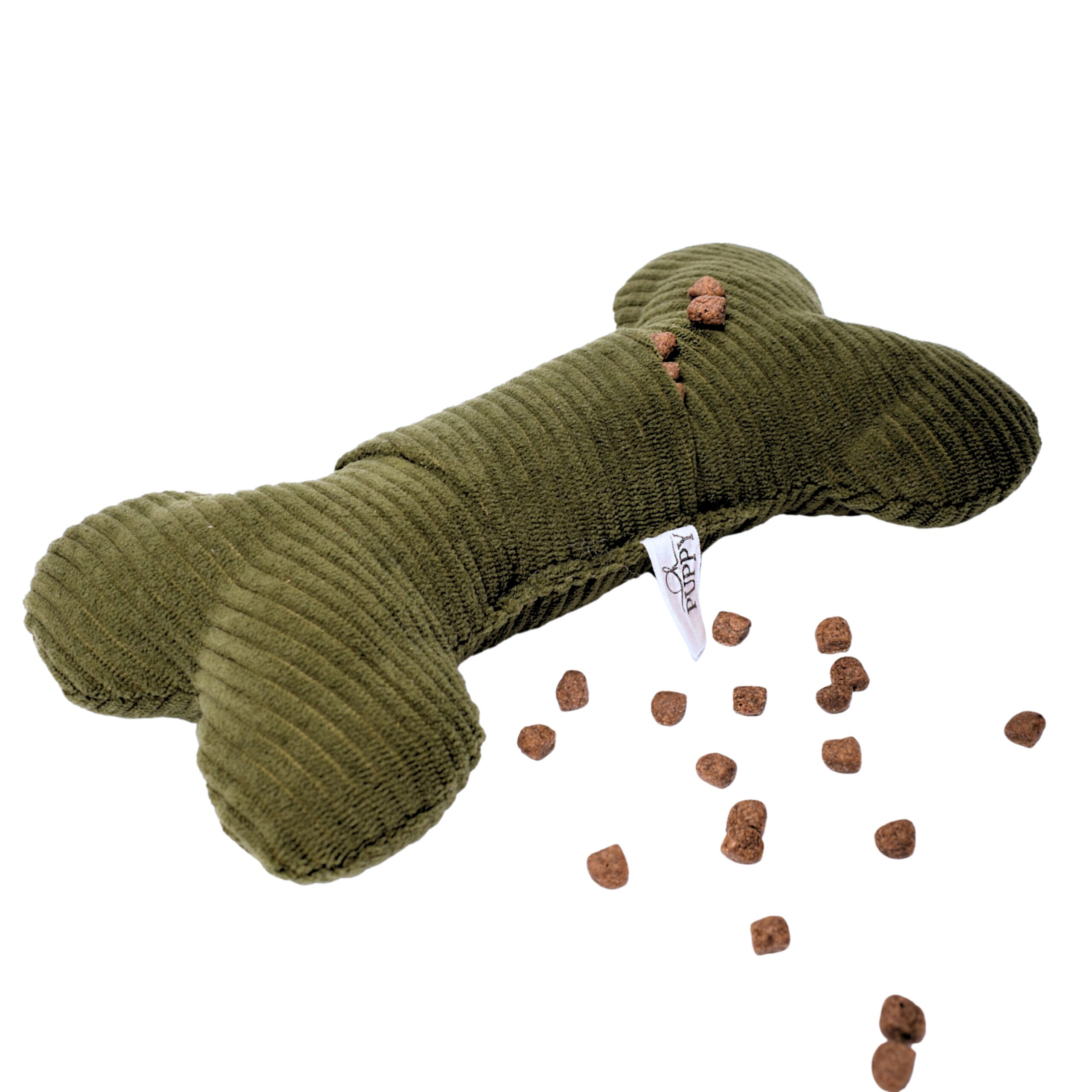Zabawka dla psa w kształcie kości to połączenie rozrywki i treningu węchowego. Na środku znajduje się specjalna, ciasna kieszonka, do której można schować smaczki, co zachęca psa do